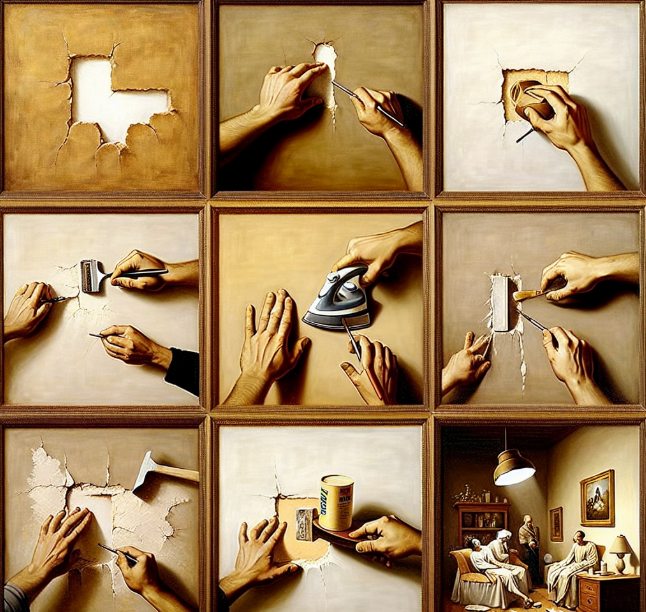 - 큰 구멍: 준비한 벽지 조각을 정확한 크기로 잘라 접착제로 붙입니다. 이때 벽지의 무늬가 주변과 일치하도록 주의합니다.